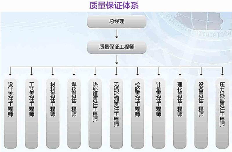 公司具有严格的质量保证体系,拥有在压力容器、压力管道行业有多年从业经验的高级工程师、工程师任质量责任工程师,对从设计、工艺、生产到产品检验的每一个环节,层层把关,严密监控,确保压力容器产品的质量与安全性能均达到甚至高于《固定式压力容器安全技术监督规程》、GB150、GB151、GB50235、GB50236等法规、标准、规范要求。
